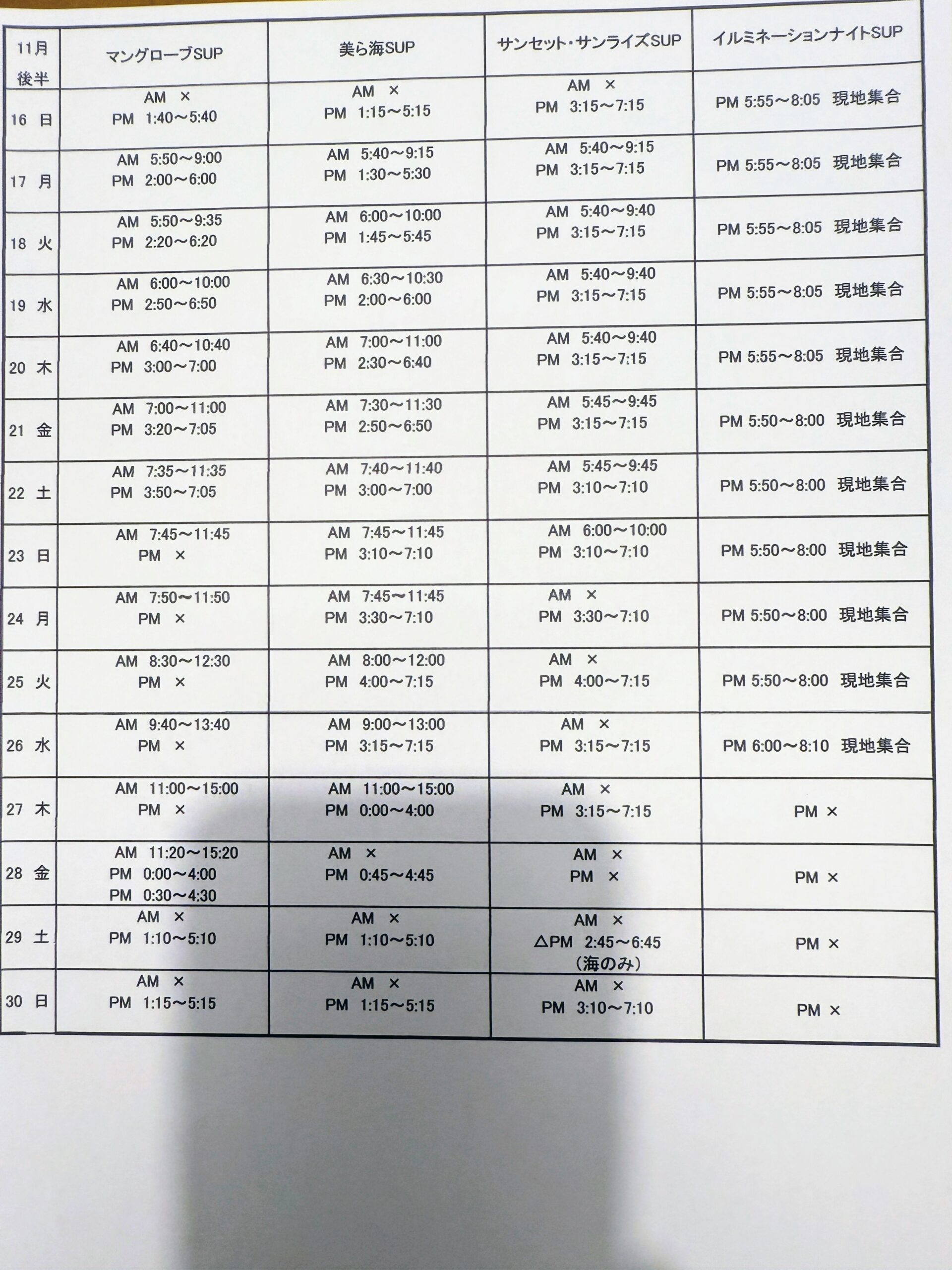 イルミネーションナイトSUPも上記の理由で毎日開催できる訳ではありませんのでご確認を宜しくお願いします。
